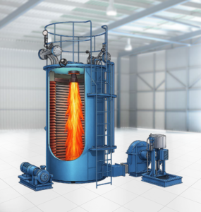 We equip our heaters with world-class, fully automatic burners (like Riello or Elco). These burners provide precise air-fuel mixing for clean, smokeless combustion.